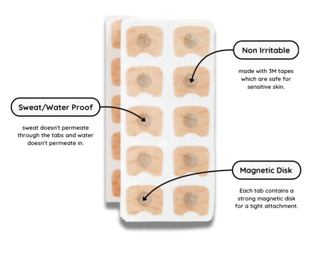 Saludea™ Breathing Aid utiliza dos pequeños parches adhesivos con imanes que se colocan en la parte exterior de cada fosa nasal. Una tira de plástico se conecta a los imanes y levanta y abre suavemente los conductos nasales, lo que aumenta el flujo de aire y alivia la congestión. Este diseño simple y no invasivo promueve la respiración natural, reduce la respiración por la boca y los ronquidos, y mejora la calidad del sueño.